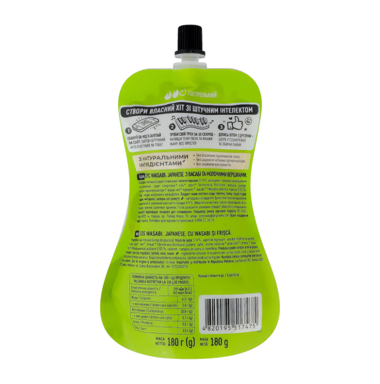 Склад (укр.) | Вода, платока (сироп глюкозний), молочні вершки 17.4%, загущувач - крохмаль кукурудзяний модифікований, оцет спиртовий, сіль, хрін (Armoracia Rusticana) порошок, цукор, натуральні ароматизатори, перець чилі, куркума, васабі (Wasabia japonica) порошок 0.02 %, барвники - мідні комплекси хлорофілінів |