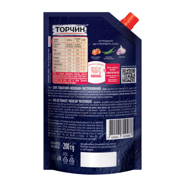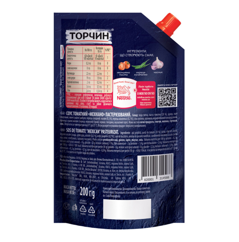 Склад (укр.)Вода питна, паста томатна (20%), цукор, оцет спиртовий, овочі сушені (цибуля, перець солодкий, часник (0.3%), перець халапеньо (0.2%)), сіль кухонна, крохмаль модифікований кукурудзяний, прянощі сушені мелені (перець червоний гіркий, кориця, гвоздика, мускатний горіх)