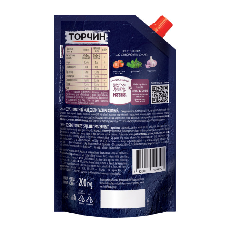 | Склад (укр.) | Вода питна, паста томатна (18%), цукор, оцет спиртовий, сіль кухонна, овочі сушені (перець солодкий, часник (0.8%), цибуля), крохмаль модифікований кукурудзяний, прянощі сушені (листя чебрецю, перець червоний гіркий, пажитник, листя коріандру (кінза), коріандр, перець чорний, лавровий лист, мускатний горіх), екстракт кропу |