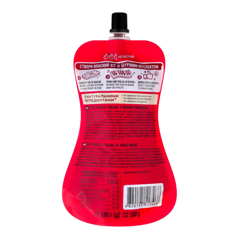 Склад: Вода, патока (сироп глюкозний), томатна паста, печериці консервовані (печериці, вода, сіль), цукровий сироп, оцет спиртовий, загущувач - крохмаль кукурудзяний модифікований, сіль, томати пластівці, цукор, цибуля ріпчаста, ароматизатор "Трюфель", перець чорний, гриб трюфель чорний (Tuber aestivum) сушений 0.1%, кориця