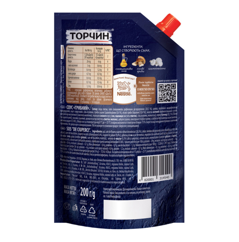| Склад (укр.) | Вода питна, олія соняшникова рафінована дезодорована (28.3%), цукор, крохмалі модифіковані кукурудзяні, оцет спиртовий, сіль кухонна, гриби сушені (шампіньйони (0.4%), лісові гриби (боровик) (0.4%)), жовток яєчний ферментований сухий, регулятор кислотності (кислота молочна), порошок соєвого соусу (соя, пшениця (містить глютен), сіль кухонна, мальтоза), зерно гірчиці (0.3%) (білої та сарептської), часник сушений, ароматизатор (містить глютен і молоко), цибуля сушена, консервант (сорбат калію), стабілізатор (камедь ксантанова), антиоксидант (Е385) |