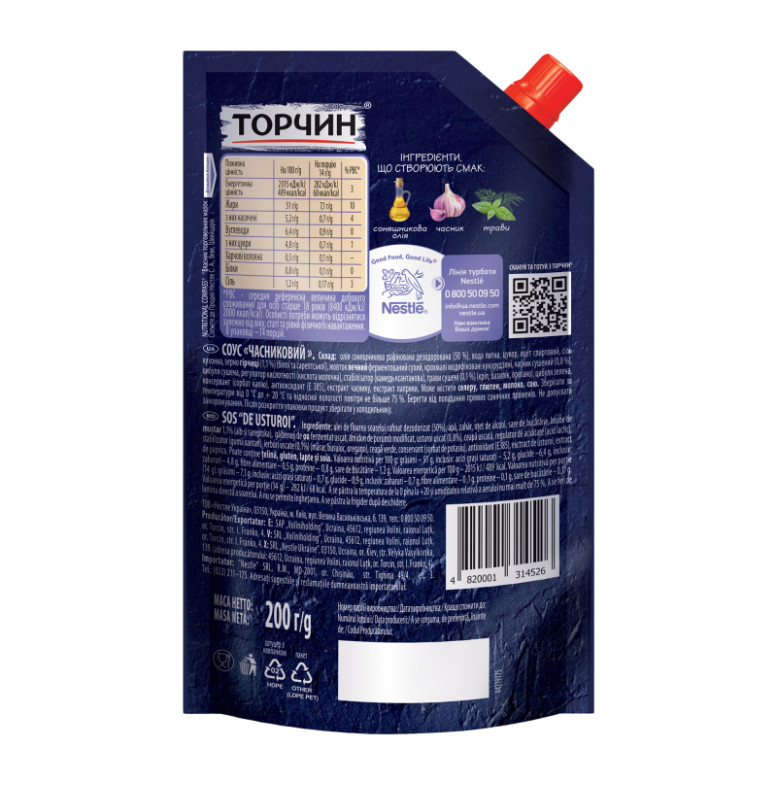 | Склад (укр.) | Олія соняшникова рафінована дезодорована (50%), вода питна, цукор, оцет спиртовий, сіль кухонна, зерно гірчиці (1.1%) (білої та сарептської), жовток яєчний ферментований сухий, крохмалі модифіковані кукурудзяні, часник сушений (0.8%), цибуля сушена, регулятор кислотності (кислота молочна), стабілізатор (камедь ксантанова), трави сушені (0.1%) (кріп, базилік, орегано), цибуля зелена, консервант (сорбат калію), антиоксидант (Е385), екстракт часнику, екстракт паприки |