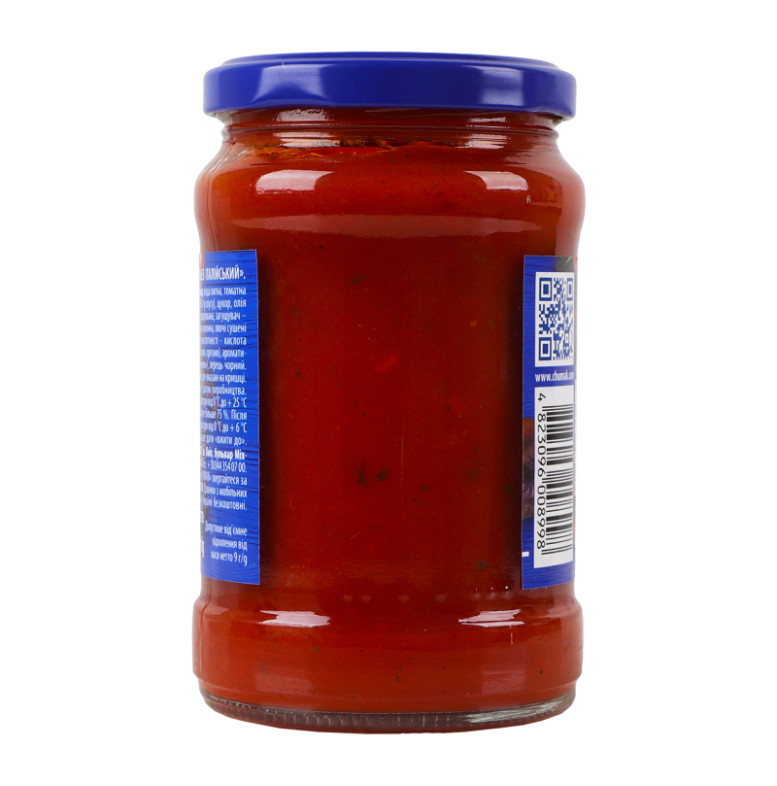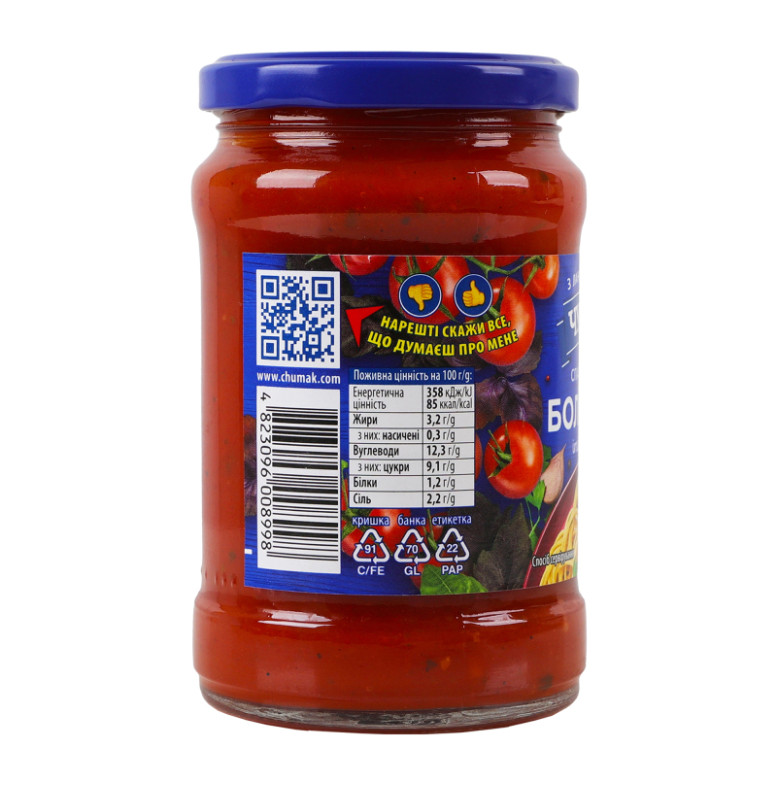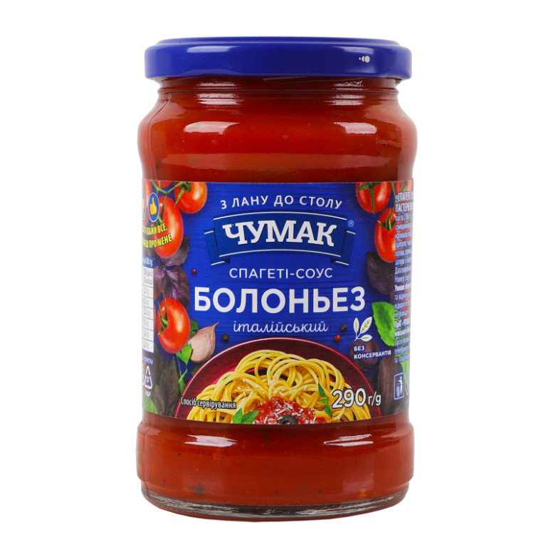 Склад: Вода питна, томатна паста (186г томатів на 100г соусу), цукор, олія соняшникова рафінована дезодорована, загущувач крохмаль модифікований, сіль кухонна, овочі сушені (цибуля, часник), регулятор кислотності кислота оцтова, прянощі (петрушка, базилік, орегано), ароматизатори ("Болоньєзе", "Яловичина"), перець чорний