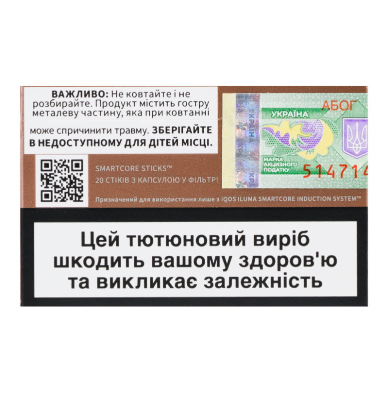 Застереження/міри безпеки (ua) | Цей тютюновий виріб шкодить вашому здоров'ю та викликає залежність. Важливо: не ковтайте і не розбирайте. Продукт містить гостру металеву частину, яка при ковтанні може спричинити травму. Зберігайте в недоступному для дітей місці |