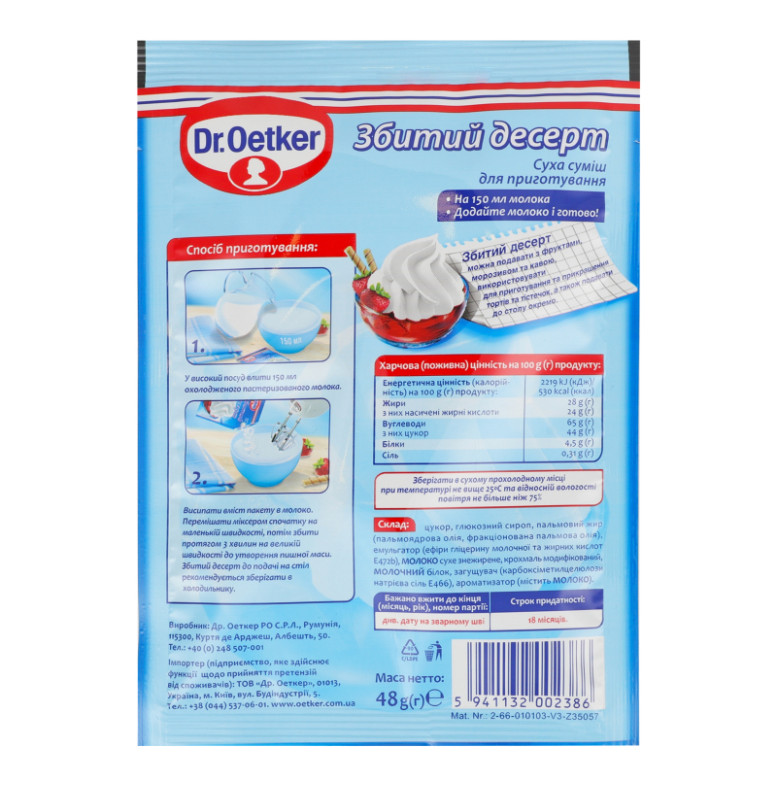 Склад: Цукор, глюкозний сироп, пальмовий жир (пальмоядрова олія, фракціонована пальмова олія), емульгатор (ефіри гліцерину молочної та жирних кислот Е472b), молоко сухе знежирене, крохмаль модифікований, молочний білок, загущувач (карбоксіметилцелюлози натрієва сіль Е466), ароматизатор (містить молоко)
