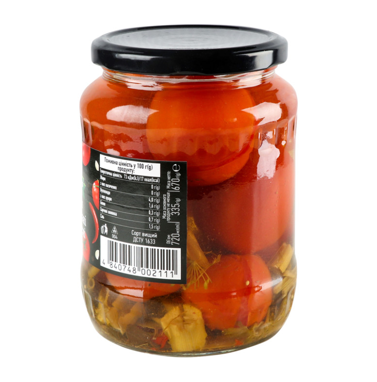 | Склад (укр.) | Томати свіжі (50%), питна вода, цукор, сіль кухонна, регулятор кислотності оцтова кислота, кріп та петрушка, лист хрону, перець гіркий, часник, лист лавровий, насіння гірчиці |