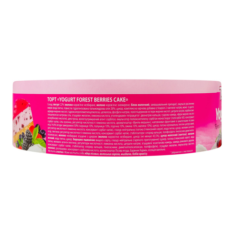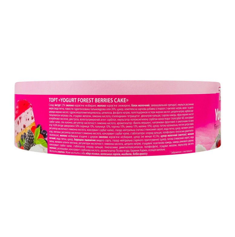 Склад (укр.) | Йогурт 22% (молоко коров'яче незбиране, молоко коров'яче знежирене, білок молочний, заквашувальний препарат), емульсія рослинних жирів (вода питна, повністю гідрогенізована пальмоядрова олія 26%, цукор, комплексна харчова добавка (стеароїл-2-лактилат натрію, моно- та дигліцериди жирних кислот, гідроксипропілметилцелюлоза, целюлоза, фосфати натрію, полігліцеринові естери жирних кислот, цитрати натрію, карбоксіметилцелюлози натрієва сіль, згущувач желатин, лимонна кислота, етилендиамін тетраацетат двонатрію-кальцію, гуарова камедь, ефіри жирних кислот аскорбінової кислоти), декстроза, вологоутримуючий агент сорбітол, емульгатор поліоксиетилену сорбітан моностеарат (полісорбат 60), консервант сорбат калію, сіль кухонна, регулятор кислотності лимонна кислота, ароматизатор "Ваніль-вершки"), наповнювач фруктовий зі шматочками лісових ягід 14.6% (ягоди заморожені 50% (чорниця 10%, полуниця 10%, порічка 10%, ожина 10%, малина 10%), цукор, патока крохмальна, пектин цитрусовий, регулятор кислотності лимонна кислота, консервант сорбат калію), глазур нейтральна (патока (глюкозний сироп), вода питна, цукор, желюючі агенти: агар, пектини, регулятор кислотності лимонна кислота, консервант сорбат калію, стабілізатори: хлорид кальцію, поліфосфати, піногасник диметилполісилоксан), молоко незбиране згущене з цукром (молоко коров'яче незбиране, цукор (не менше 43.5%), цукор молочний (лактоза)), меланж яєчний, вода питна, цукор, борошно пшеничне вищого сорту, глазур нейтральна (гарячого приготування) (цукор, патока (глюкозний сироп), вода питна, желюючі агенти пектини, регулятори кислотності: лимонна кислота, цитрати натрію, згущувачі: ксантанова камедь, камедь ріжкового дерева, консервант сорбат калію, стабілізатор хлорид кальцію, піногасники: диметилполісилоксан, поліфосати), згущувач желатин, емульгатор (містить молоко), розпушувач, консервант сорбінова кислота, ароматизатор Лісова ягода, барвник Кармін, есенція ванільна |