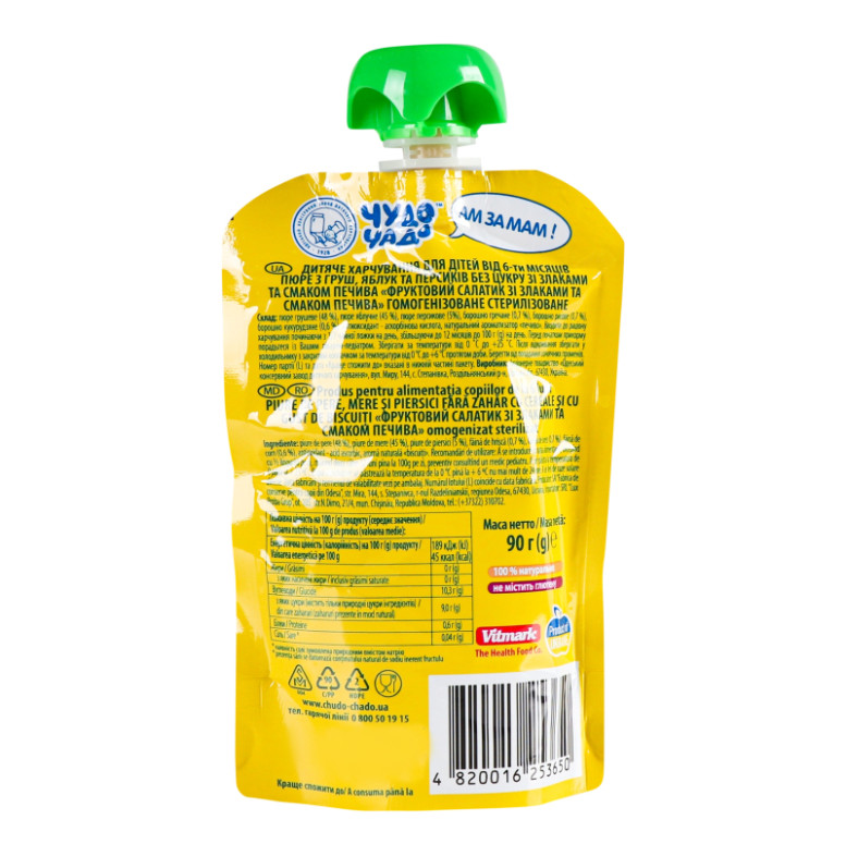 Склад (укр.): Пюре грушеве (48%), пюре яблучне (45%), пюре персикове (5%), борошно гречане (0.5%), борошно рисове (0.5%), борошно кукурудзяне (0.5%), борошно вівсяне (0.5%), антиоксидант - аскорбінова кислота, натуральний ароматизатор "печиво"