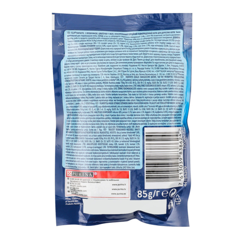 | Склад (укр.) | М'ясо та субпродукти тваринного походження (14%, з яких 4% яловичини), екстракти рослинного протеїну, риба та продукти переробки риби, мінеральні речовини, цукри, шматочки 44% м'яса та субпродуктів тваринного походження |