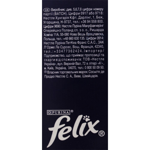 Склад: М'ясо та субпродукти тваринного походження (14%, з яких 4% яловичини), екстракти рослинного протеїну, риба та продукти переробки риби, мінеральні речовини, цукри, шматочки 44% м'яса та субпродуктів тваринного походження