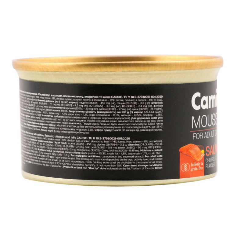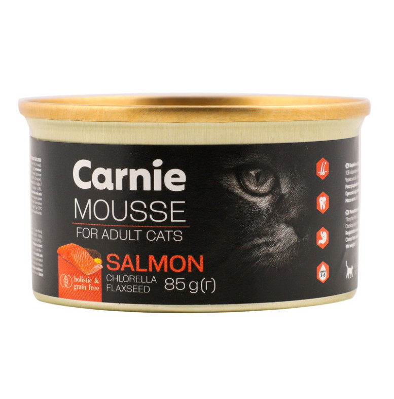 Корм д/дорослих котів Мус з лососем насінням льону хлорелою та желе 85г ж/б Carnie