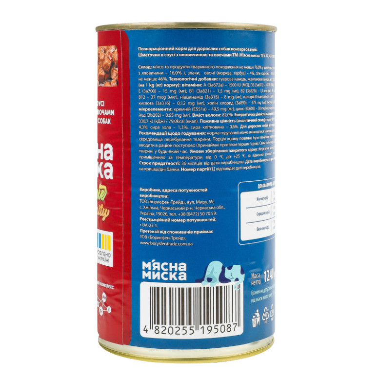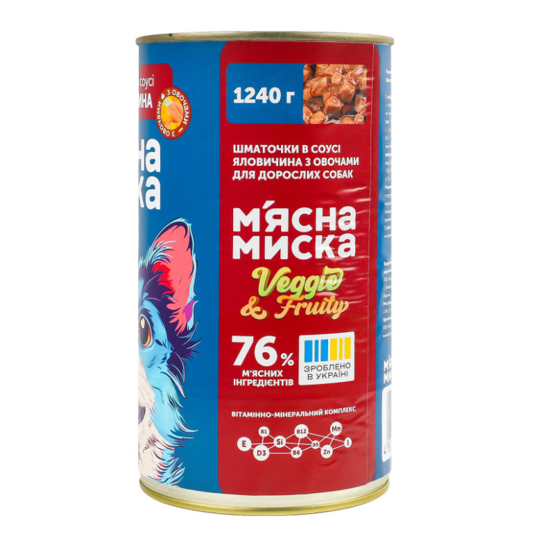 Корм консервований повнораціонний для дорослих собак Шматочки в соусі з яловичиною та овочами М'ясна Миска з/б 1.24кг