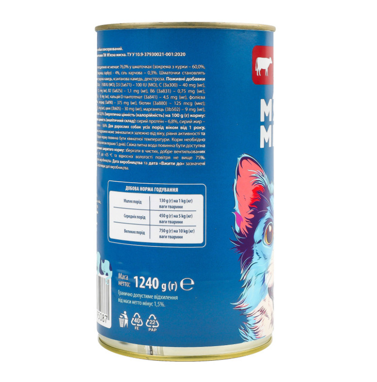 | Склад (укр.) | М'ясо та продукти тваринного походження не менше 76% у шматочках (зокрема з курки - 60%, з яловичини - 16%), злаки, овочі (морква, гарбуз) - 4%, сіль харчова - 0.3% |