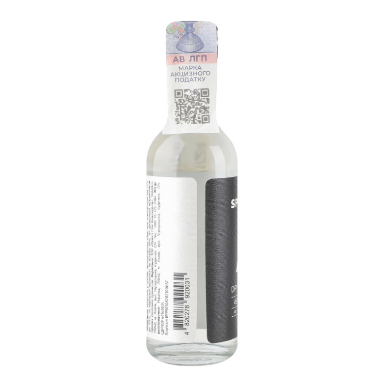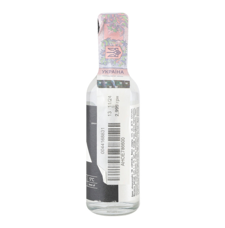 Склад: Вода питна підготовлена, ароматний спирт (дистилят з спирту етилового ректифікованого "Люкс" настояного на ягодах ялівцю, спеціях, цедрі цитрусових)