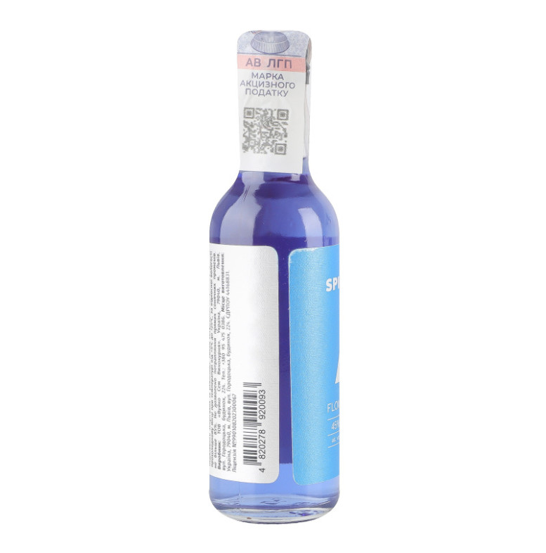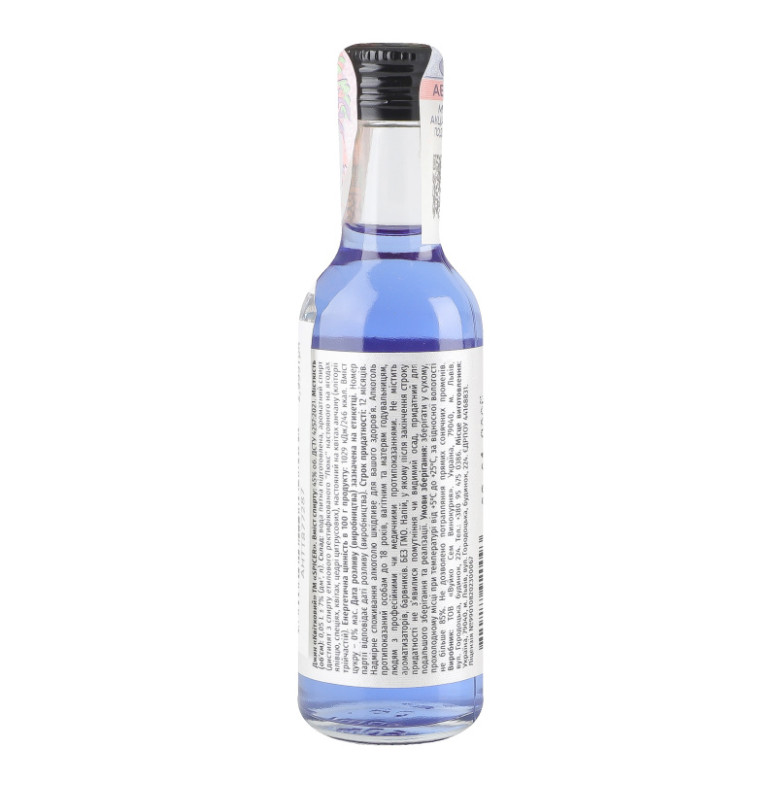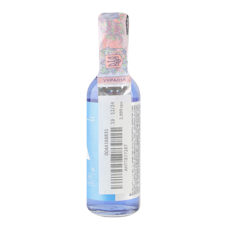 Склад: Вода питна підготовлена, ароматний спирт (дистилят з спирту етилового ректифікованого "Люкс" настояного на ягодах ялівцю, спеціях, квітах, цедрі цитрусових), настояний на квітах анчану (кліторії трійчастої)
