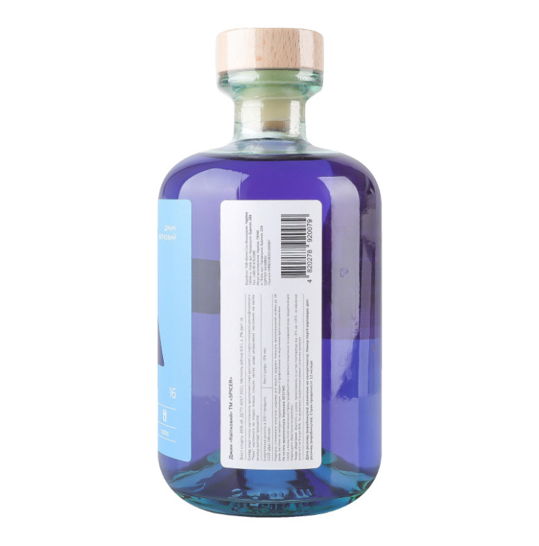 Склад: Вода питна підготовлена, ароматний спирт (дистилят з спирту етилового ректифікованого "Люкс" настояного на ягодах ялівцю, спеціях, квітах, цедрі цитрусових), настояний на квітах анчану (кліторії трійчастої)