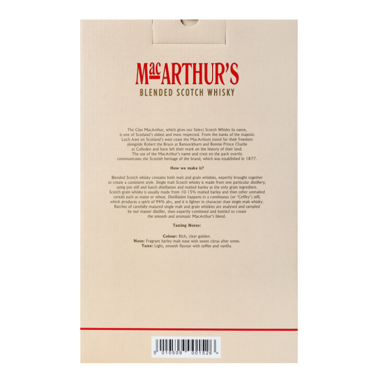Склад: Шотландське віскі, дистильоване з солоду ячменю, пшениці, кукурудзи, води, дріжджів, вода, стабілізатор кольору карамель (Е150а: цукровий колер)