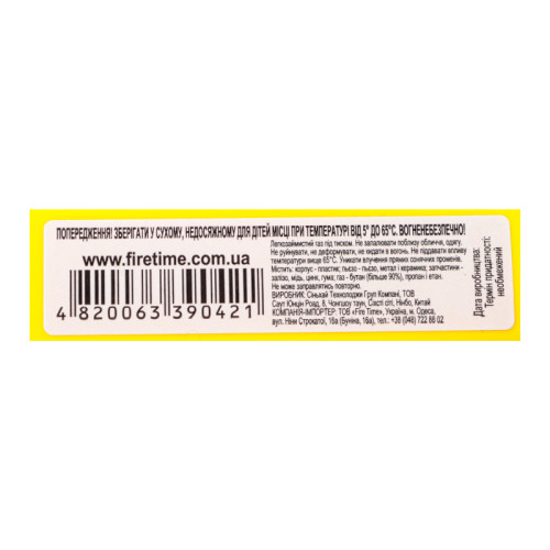 | Склад (укр.) | Корпус - пластик, п'єзо - п'єзо, метал і кераміка, запчастини - залізо, мідь, цинк, гума, газ - бутан (більше 90%), пропан і етан |