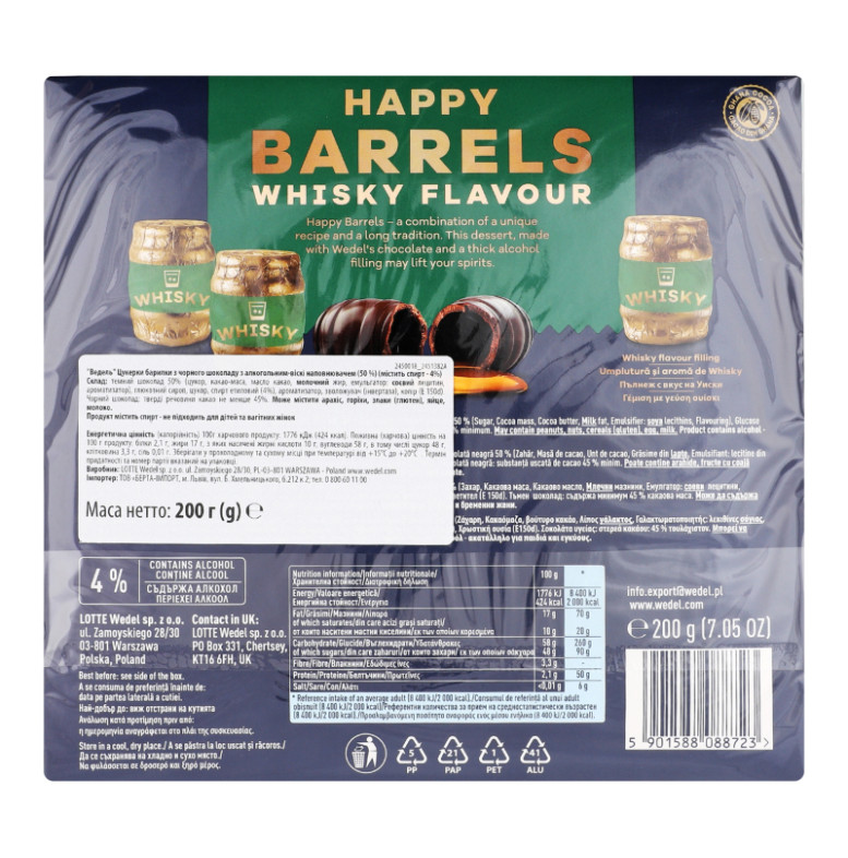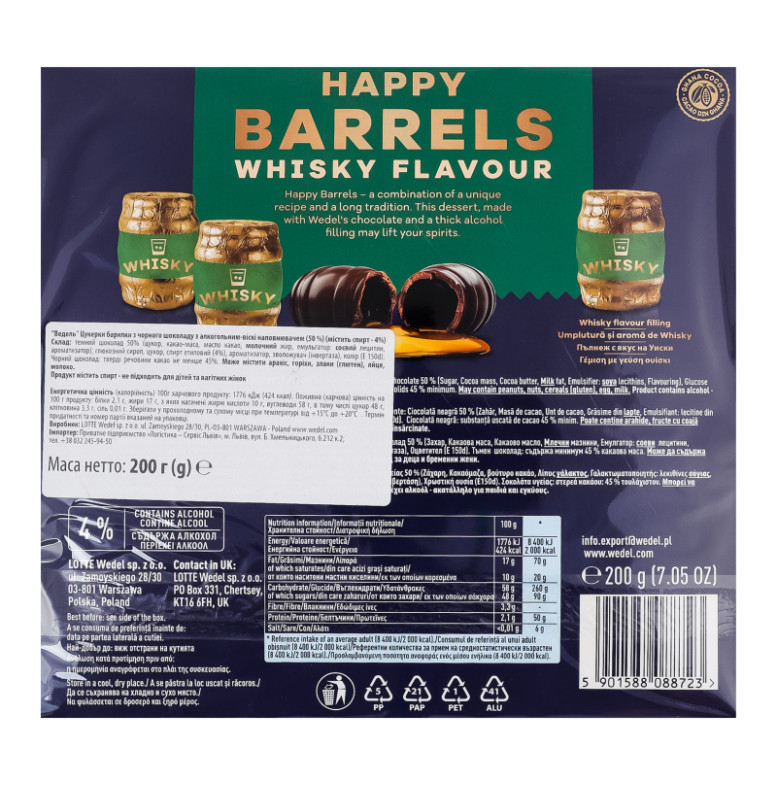 Цукерки з чорного шоколаду з алкогольним-віскі наповнювачем Happy barrels E.Wedel к/у 200г