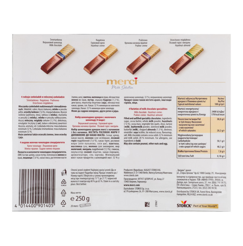 | Склад (укр.) | Цукор, какао-масло, молоко сухе незбиране, лісовий горіх подрібнений (7.6%), какао терте, рослинні жири (олія пальмова, олія ши), лактоза, маслянка суха, молоко сухе знежирене, жир молочний, мигдаль подрібнений (1.3%), глюкоза, емульгатор соєвий лецитин, какао-порошок, ароматизатори, сіль харчова |
