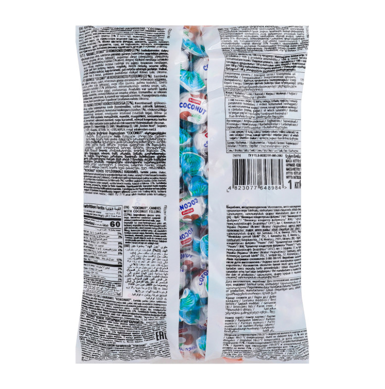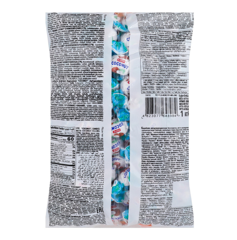 | Склад (укр.) | Патока, цукор, продукт молоковмісний згущений (молоко знежирене згущене, цукор, замінник молочного жиру (негідрогенізована пальмова олія), лактоза), жир рослинний (негідрогенізовані пальмова, пальмоядрова олії), кокосова крихта сушена (5% в начинці), вологоутримуючий агент сорбітовий сироп, сіль, емульгатори лецитини (містить сою), ароматизатор |