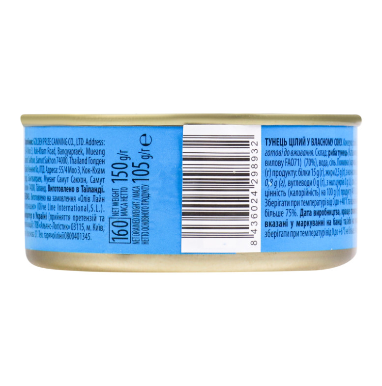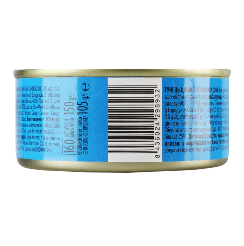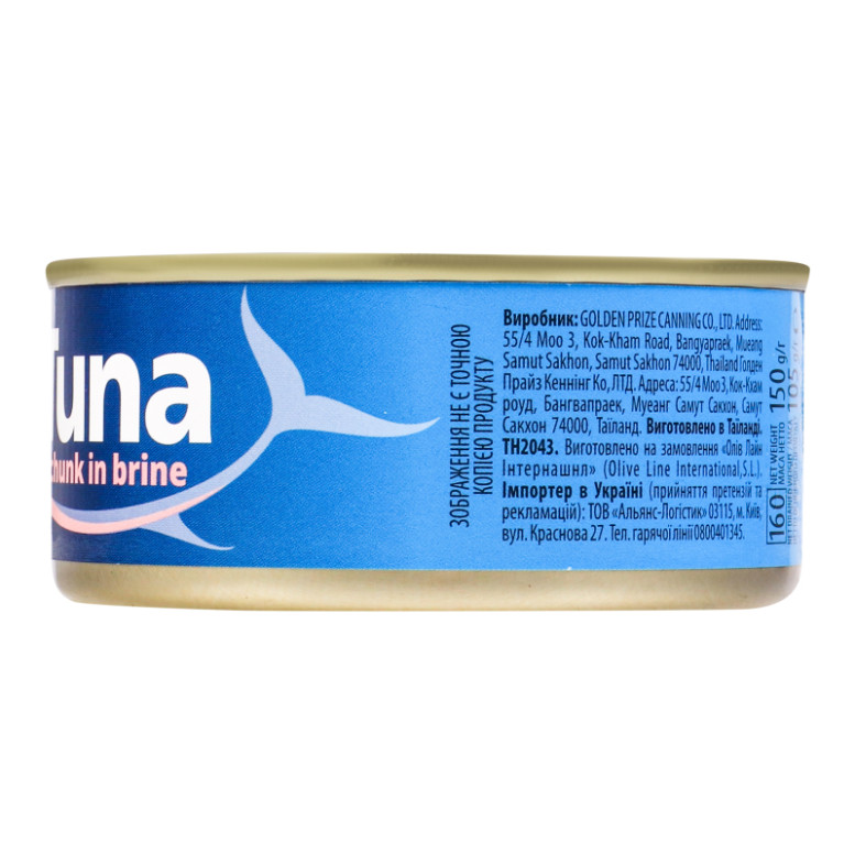 Склад (укр.): Риба тунець (Katsuwonus pelamis, район вилову FA071) (70%), вода, сіль