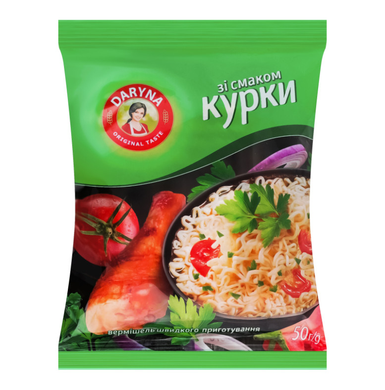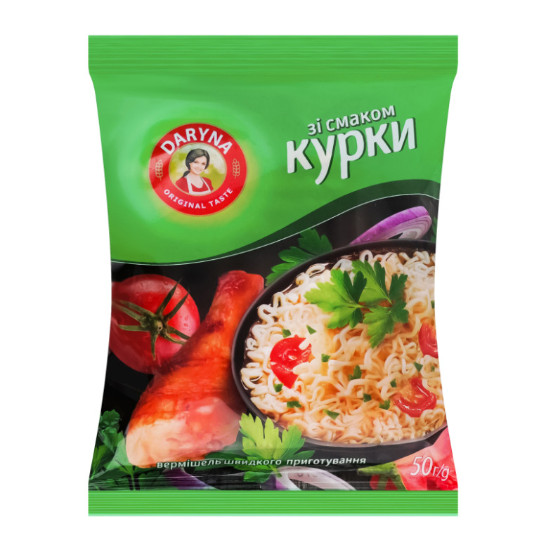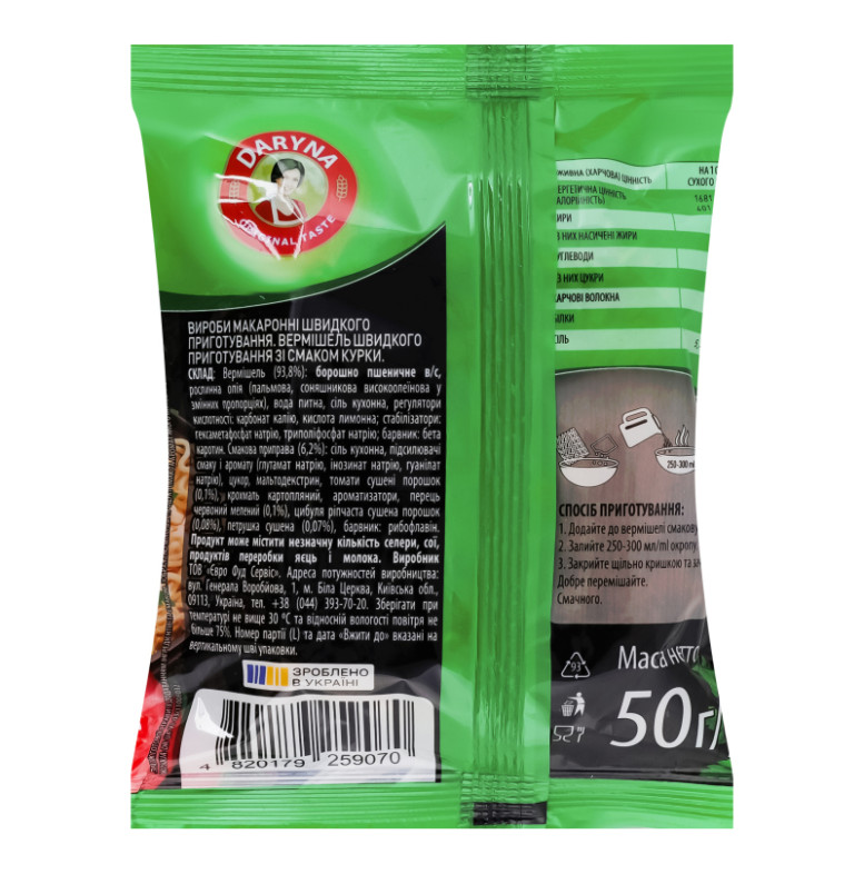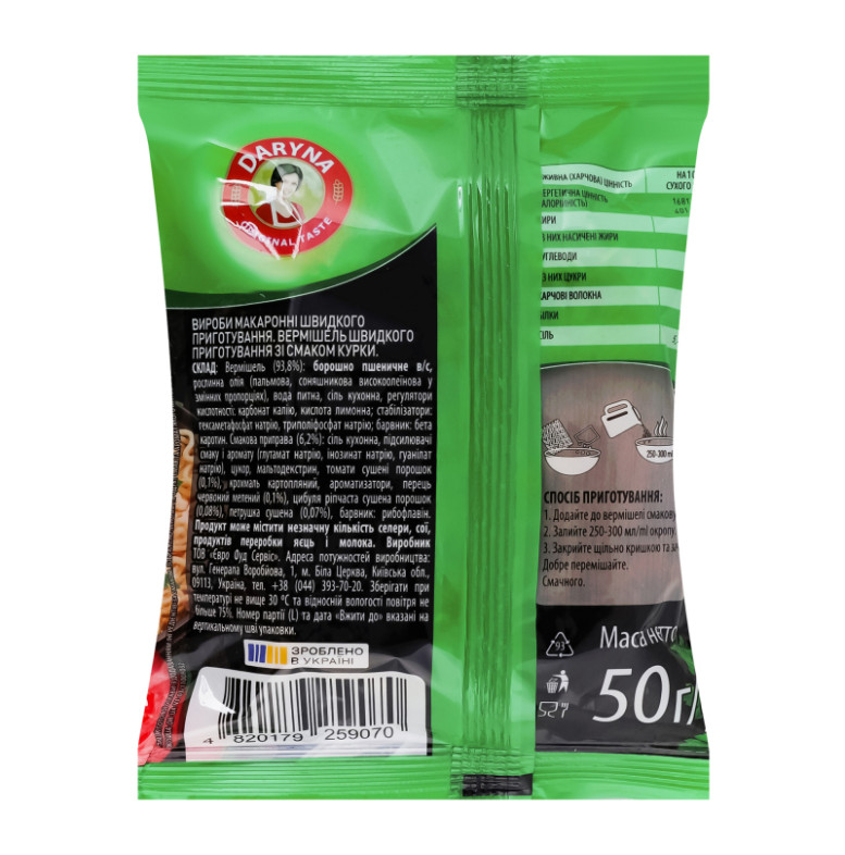 Склад: Вермішель (93.8%): борошно пшеничне в/с, рослинна олія (пальмова, соняшникова високоолеїнова у змінних пропорціях), вода питна, сіль кухонна, регулятори кислотності: карбонат калію, кислота лимонна, стабілізатори: гексаметафосфат натрію, триполіфосфат натрію, барвник: бета-каротин. Смакова приправа (6.2%): сіль кухонна, підсилювачі смаку і аромату (глутамат натрію, інозинат натрію, гуанілат натрію), цукор, мальтодекстрин, томати сушені порошок (0.1%), крохмаль картопляний, ароматизатори, перець червоний мелений (0.1%), цибуля ріпчаста сушена порошок (0.08%), петрушка сушена (0.07%), барвник: рибофлавін