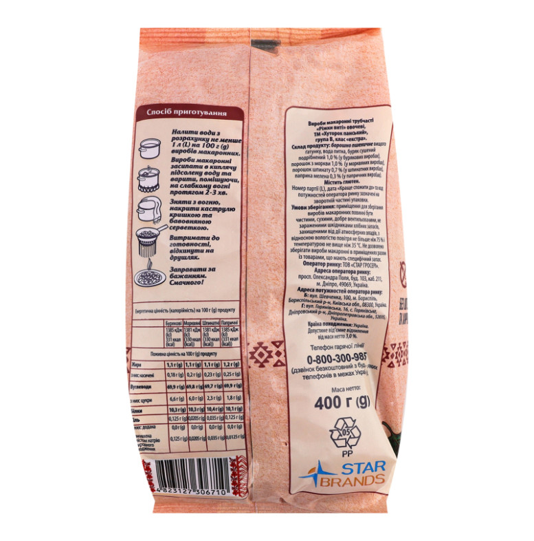 | Склад (укр.) | Борошно пшеничне вищого сорту, вода питна, буряк сушений подрібнений 1% (у бурякових виробах), порошок з моркви 1% (у морквяних виробах), порошок шпинату 0.7% (у шпинатних виробах), паприка мелена 0.3% (у папричних виробах) |