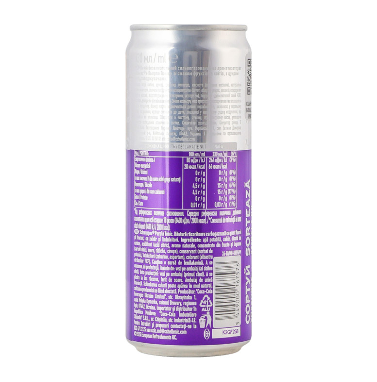 Склад (укр.) | Вода питна, цукор, діоксид вуглецю, кислота (лимонна кислота), натуральні ароматизатори, овочеві та фруктові концентрати (батат, яблуко, редис, вишня), консервант (сорбат калію), підсолоджувачі (сахарини, аспартам), барвник (діамантовий синій FCF) |