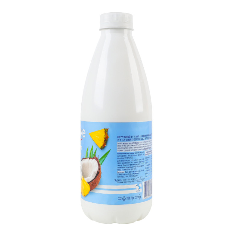 | Склад (укр.) | Молоко нормалізоване, цукор, наповнювач "Ананас-кокос" 5% ароматизатори кокоса та ананаса, регулятор кислотності кислота лимонна, барвник куркумін), загущувач крохмаль, закваски бактеріальні |