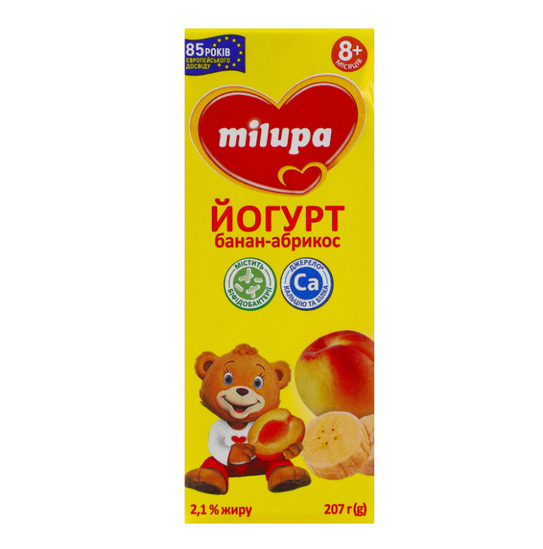 Йогурт 2.1% для дітей від 8міс з біфідобактеріями з наповнювачем Банан-абрикос Milupa т/п 207г