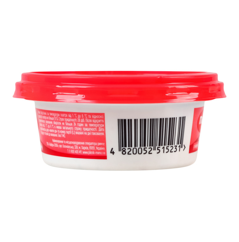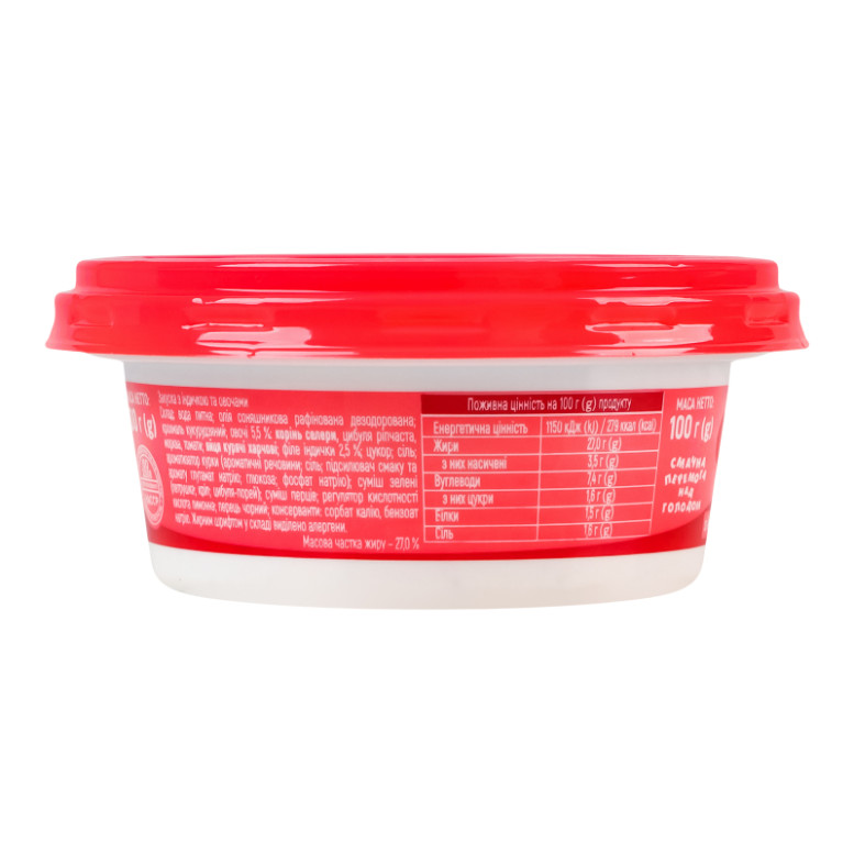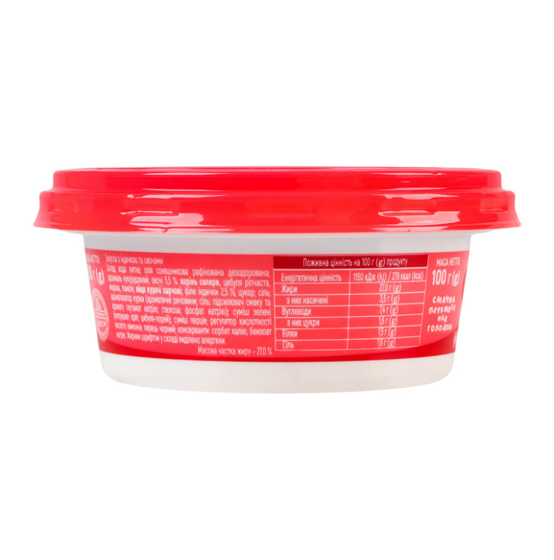Склад: Ікра капсульована зі смаком "Лосось" 35% (бульйон рибний (вода питна, сировина рибна з лососевих видів риб), крохмаль кукурудзяний модифікований, сіль кухонна, цукор, загущувач (камедь целюлозна), желюючий агент (альгінат натрію), стабілізатор кислотності (кислота лимонна)), вода питна, олія соняшникова рафінована дезодорована, концентрат сироваткових білків, крохмаль кукурудзяний модифікований, сіль кухонна, вологоутримуючий агент (гліцерин), порошок сирний, емульгатор (лецитин соєвий), цукор, ароматизатори (містять рибу), порошок рибний 0.2%, дріжджовий екстракт, загущувач (ксантанова камедь), регулятор кислотності (кислота лимонна), консервант (сорбат калію), антиоксидант (екстракт розмарину)