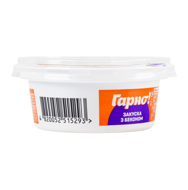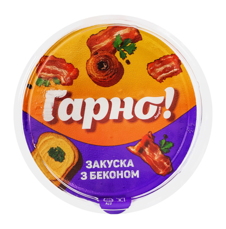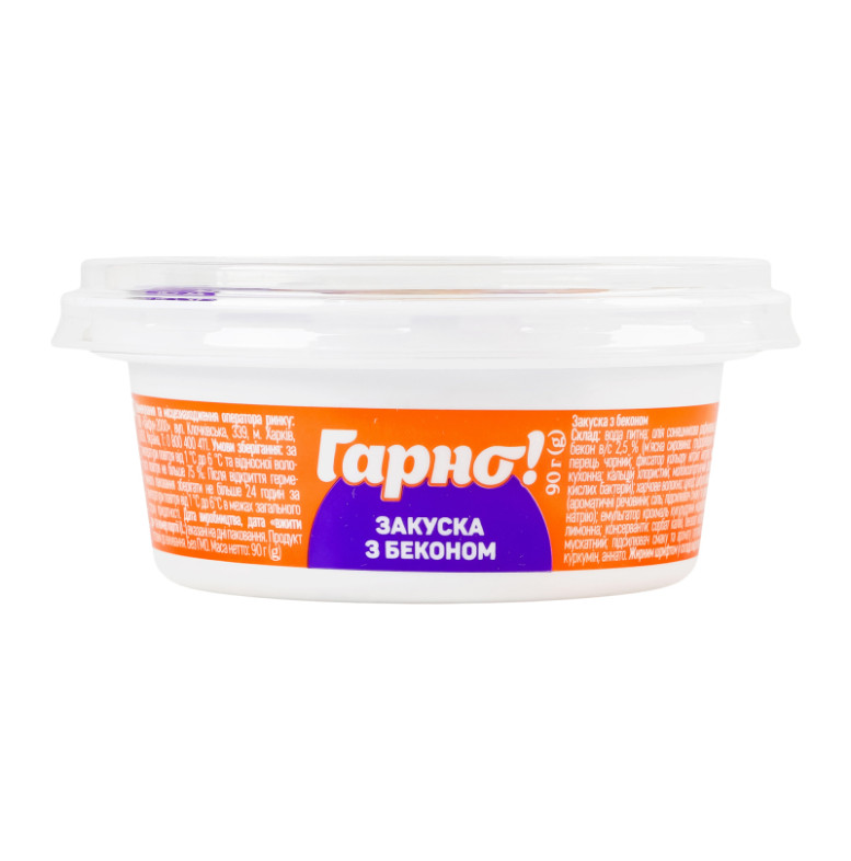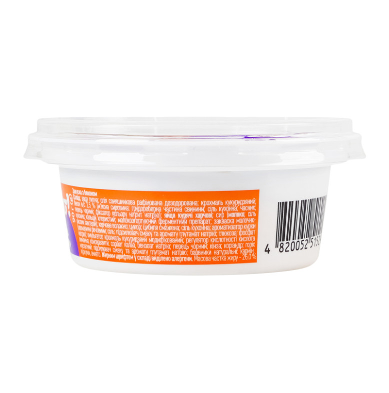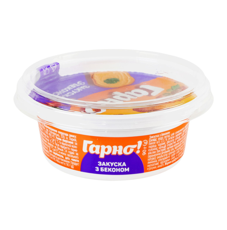 Склад: Вода питна, олія соняшникова рафінована дезодорована, крохмаль кукурудзяний, бекон в/с 2.5% (м'ясна сировина: грудореберна частина свинини, сіль кухонна, часник, перець чорний, фіксатор кольору нітрит натрію), яйця курячі харчові, сир (молоко, сіль кухонна, кальцій хлористий, молокозгортуючий ферментний препарат, закваска молочнокислих бактерій), харчове волокно, цукор, цибуля смажена, сіль кухонна, ароматизатор курки (ароматичні речовини, сіль, підсилювач смаку та аромату глутамат натрію, глюкоза, фосфат натрію), емульгатор крохмаль кукурудзяний модифікований, регулятор кислотності кислота лимонна, консерванти: сорбат калію, бензоат натрію; перець чорний, кінза, коріандр, горіх мускатний, підсилювач смаку та аромату глутамат натрію, барвники натуральні: кармін, куркумін, аннато