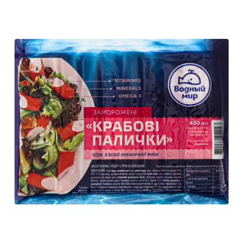 Склад (укр.): Сурімі (рибний фарш, цукор, стабілізатор пірофосфат тетранатрію, текстуратори: трифосфат натрію, сорбіт) 43%, вода питна, крохмаль картопляний, крохмаль кукурудзяний сухий, яєчний білок рідкий пастеризований 5%, олія соняшникова рафінована дезодорована, сіль кухонна, цукор білий, аромат Крабу (аромат крабу натуральний, згущувач мальтодекстрин, стабілізатор хлорид натрію, підсилювач смаку та аромату натрію глутамат), суміш комплексна стабілізаційна (стабілізатори: каррагінан, камедь тари, желюючий агент хлорид калію, стабілізатор ксантанова камедь), стабілізатор камедь тари, натуральний барвник (барвник кармін, вода, барвник паприка), підсилювач смаку та аромату глутамат натрію, білий пігмент двоокис титану харчовий