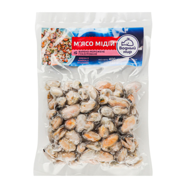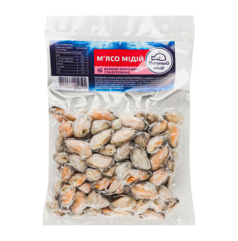 | Склад (укр.) | М'ясо мідій варено-морожене 60%, крижана глазур 40% (вода питна заморожена) |